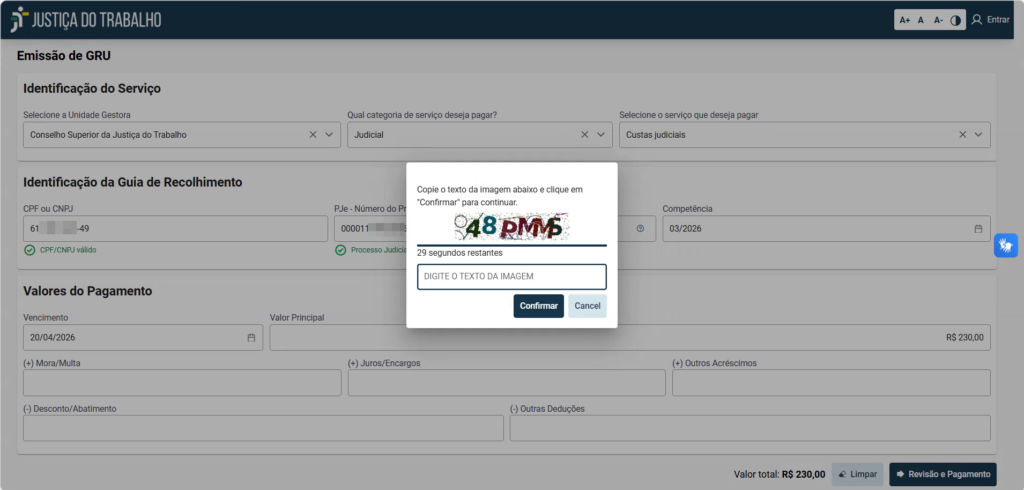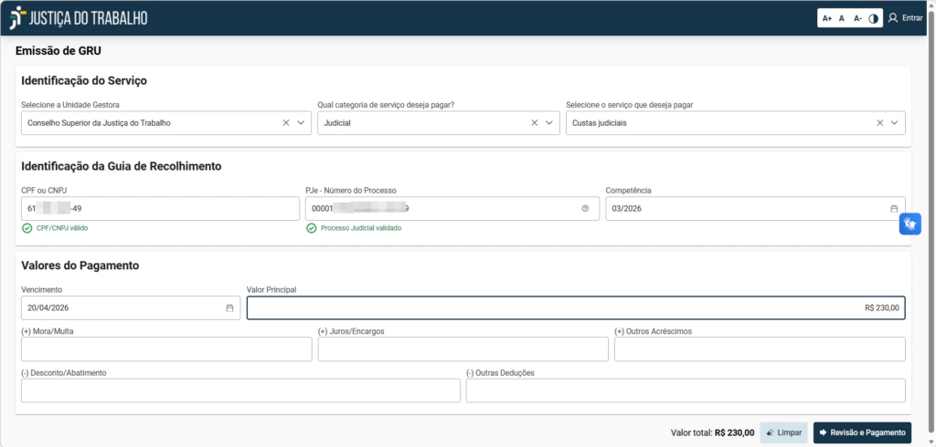 - O botão “Revisão e Pagamento” não está disponível: Verifique se você preencheu o campo “Valor Principal”, pois ele é obrigatório para que o sistema permita avançar.